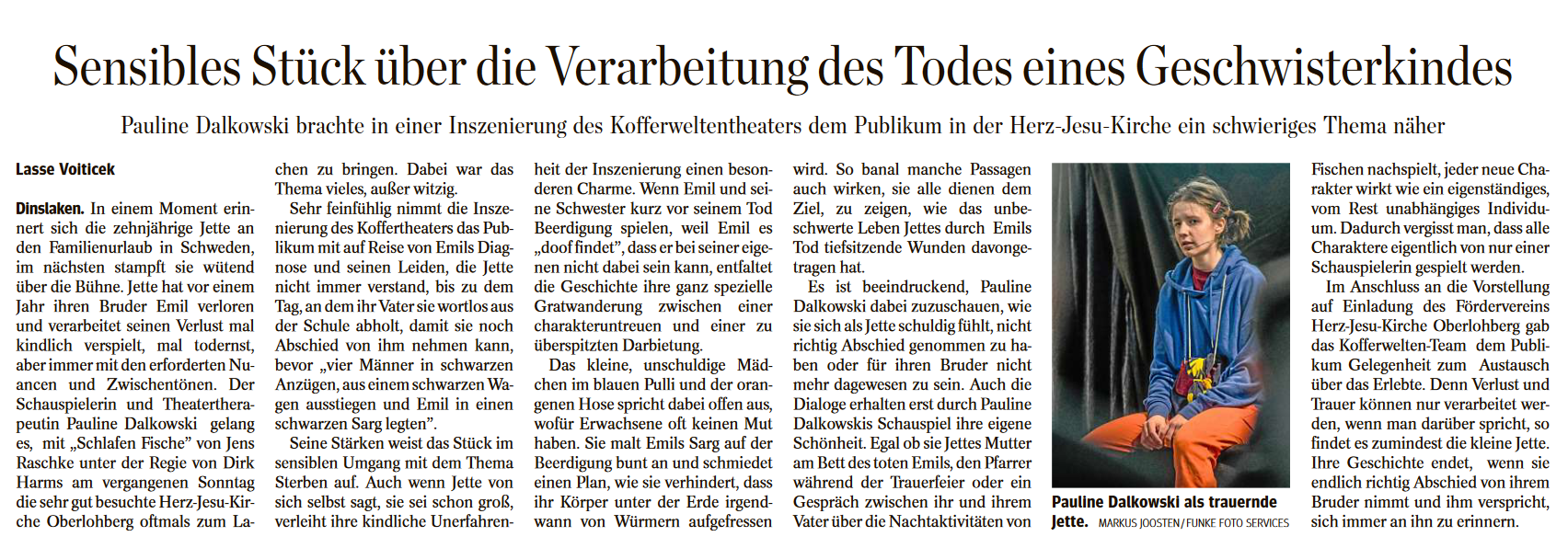 Unter der Regie von Dirk Harms und mit Pauline Dalkowski in der Rolle der Jette konnten rund 70 Zuschauer*innen erleben, wie Jette aus ihrer kindlichen Perspektive erzählt, wie es ist, wenn jemand stirbt, welche Fragen sie sich gestellt hat, und dass manche Antworten nur sie selber finden kann.